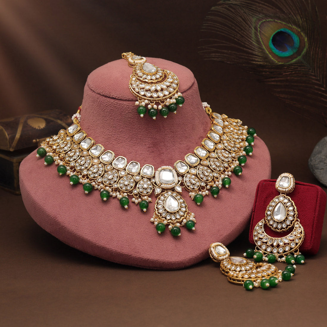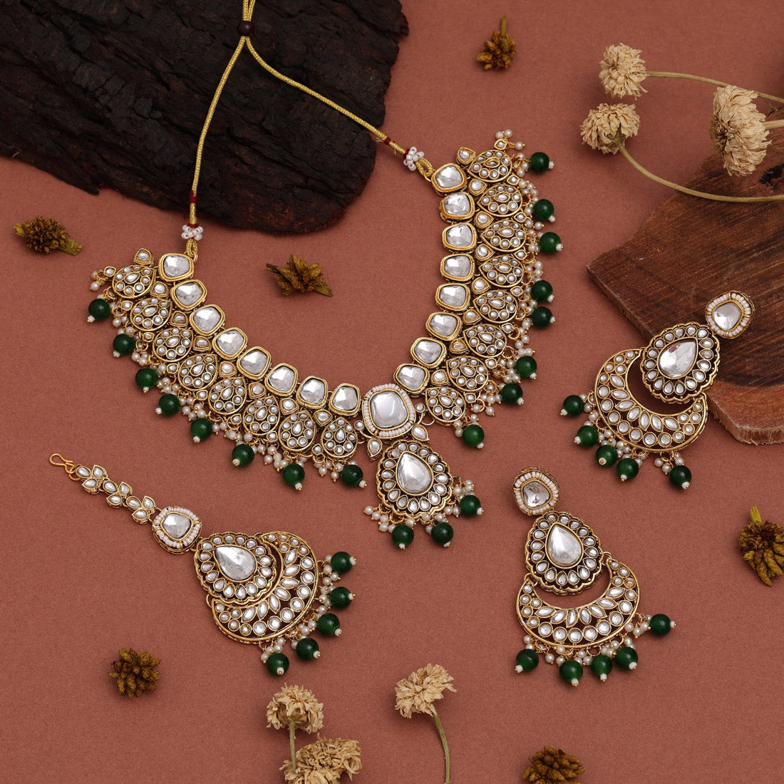 Green Color Kundan Necklace Set With Ethnic Vibes And Bold Accents