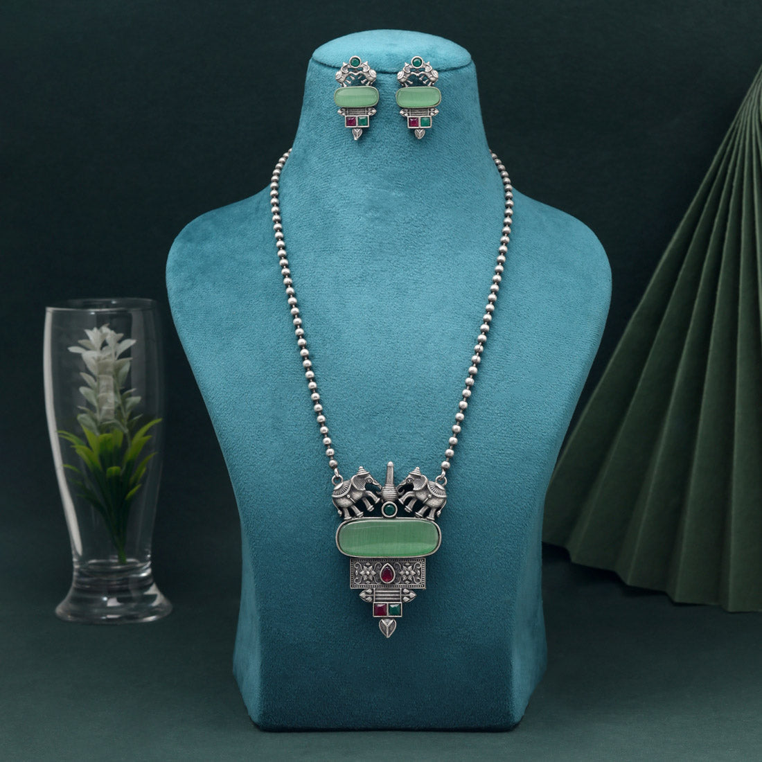 Light Green Color Long Oxidised Necklace Set For Stylish Festive Occasions