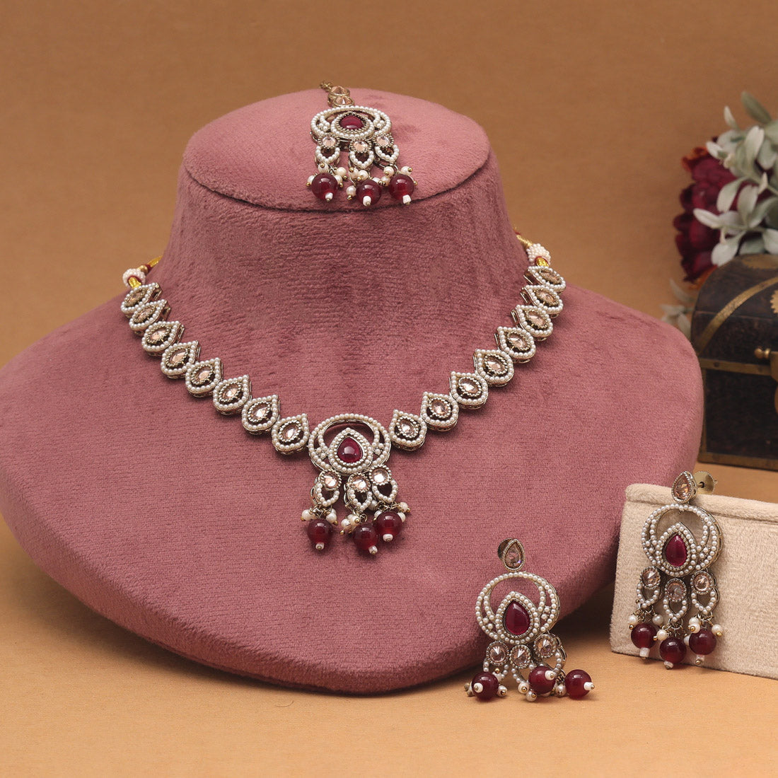 Sophisticated Maroon Color American Diamond Necklaces Set For Grand Events