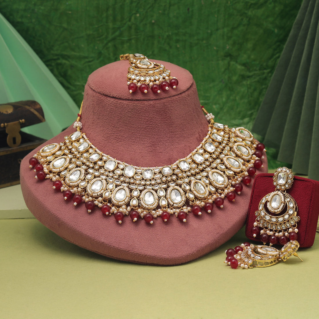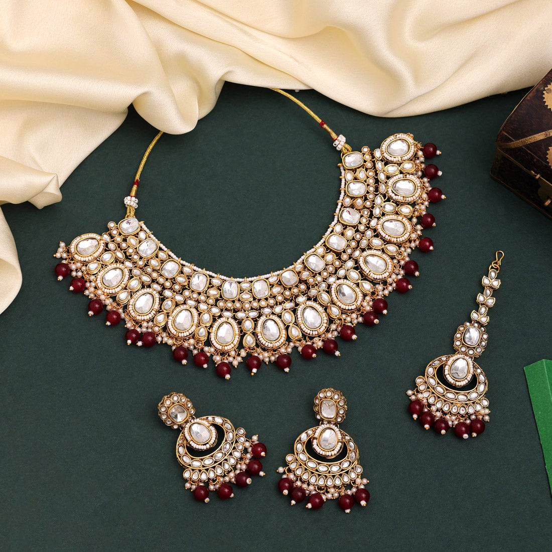 Royal Maroon Color Kundan Necklace Set With Heavy Stone Work Finish