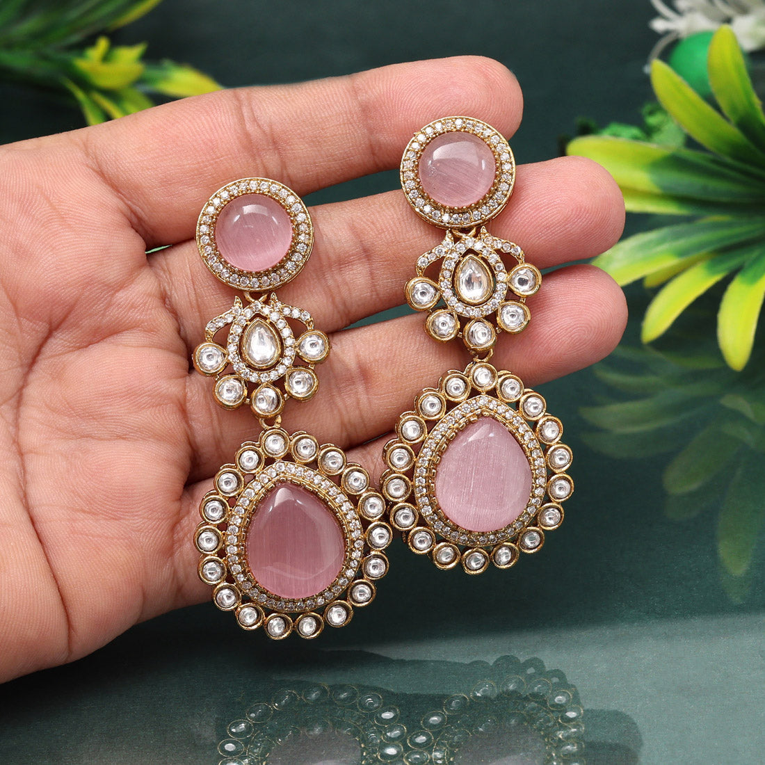 Delicate Pink Color American Diamond Earrings For Feminine Ethnic Wear