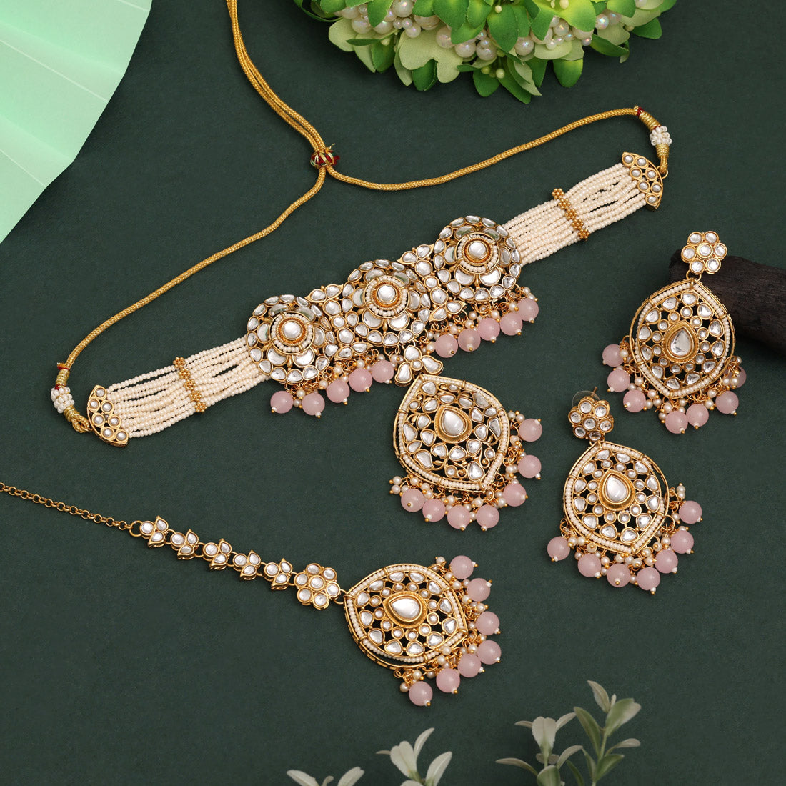 Pink Color Choker Kundan Necklace Set With Pearl Bead Droplets