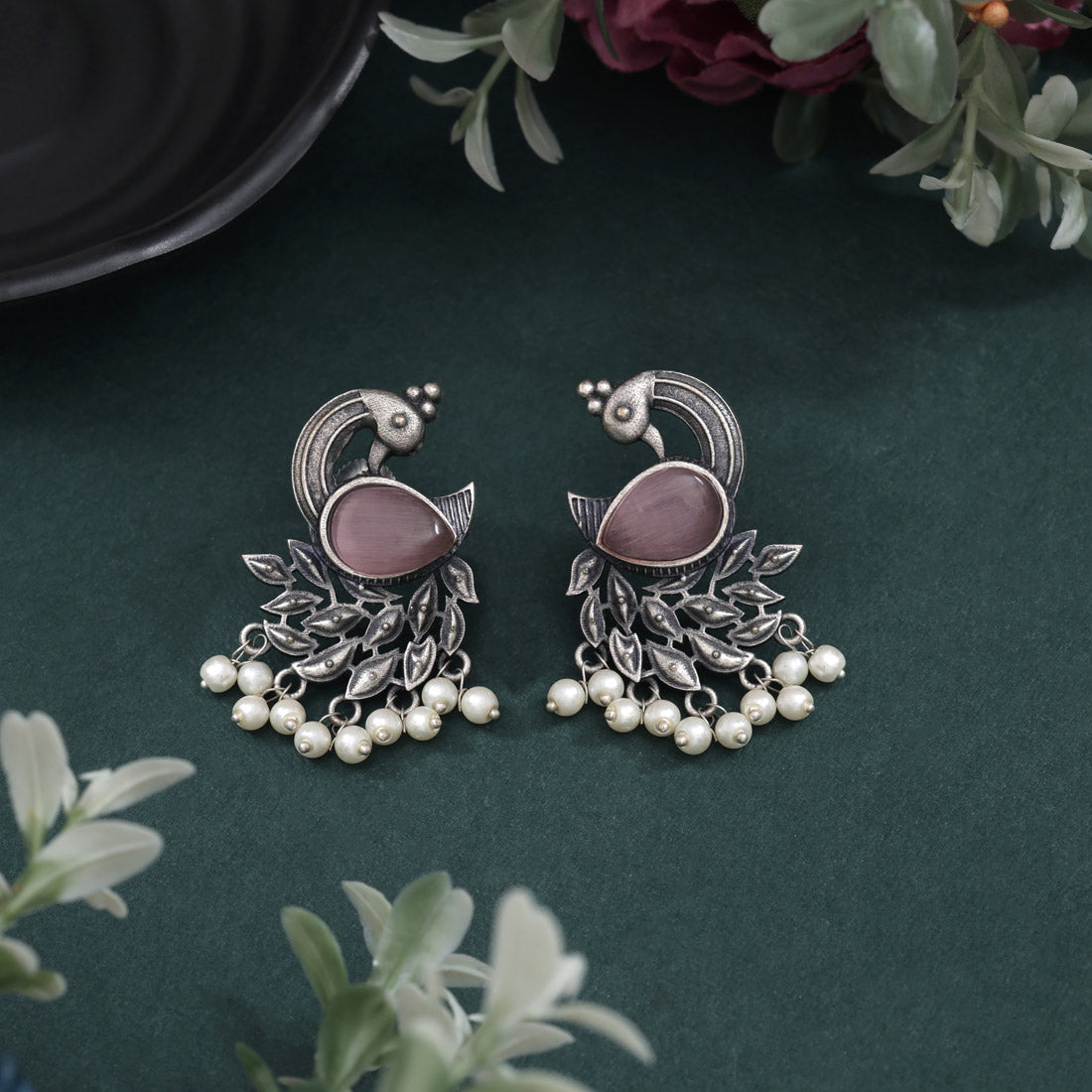Pink Color Oxidised Earrings With Floral Patterns And Antique Charm