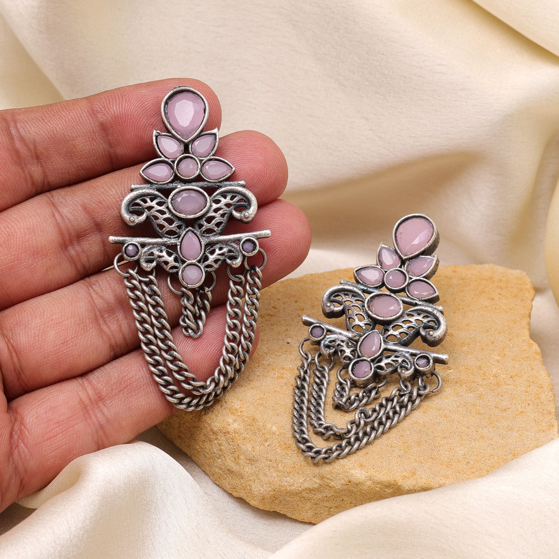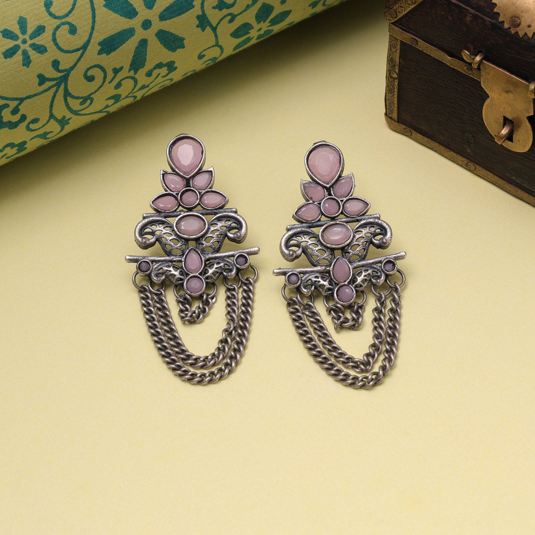 Pink Color Oxidised Fashion Earrings With Mirror Accents And Tribal Art