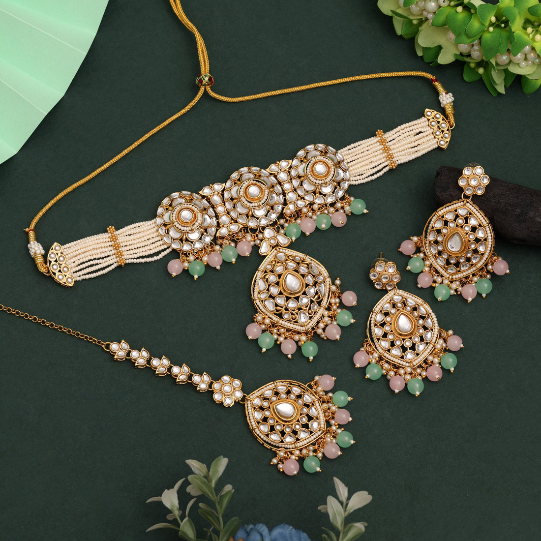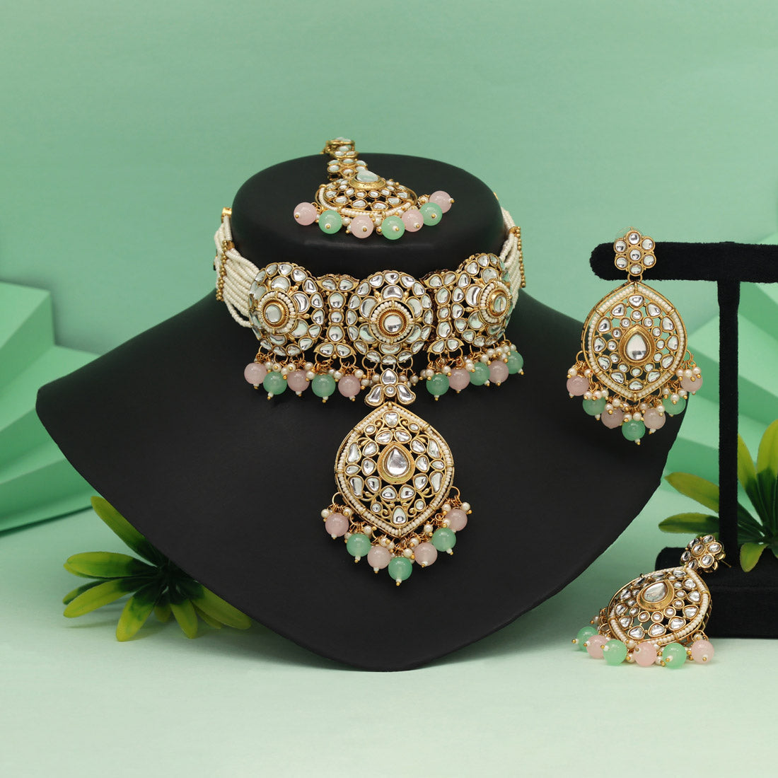 Pink & Pista Green Color Choker Kundan Necklace Set With Gem Accents