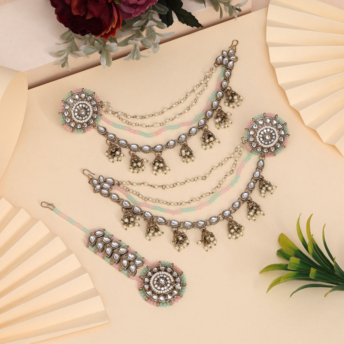 Blush & Mint Pista Green Color Kundan Earrings With Maang Tikka