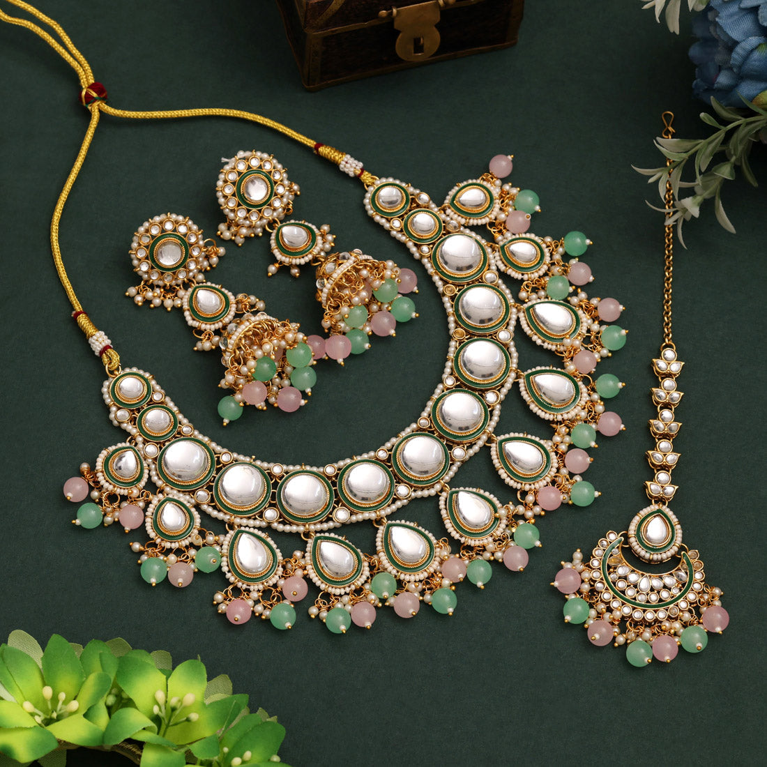 1 Piece Of Necklace:: 1 Pair Of Earring:: 1 Piece Of Maang Tikka