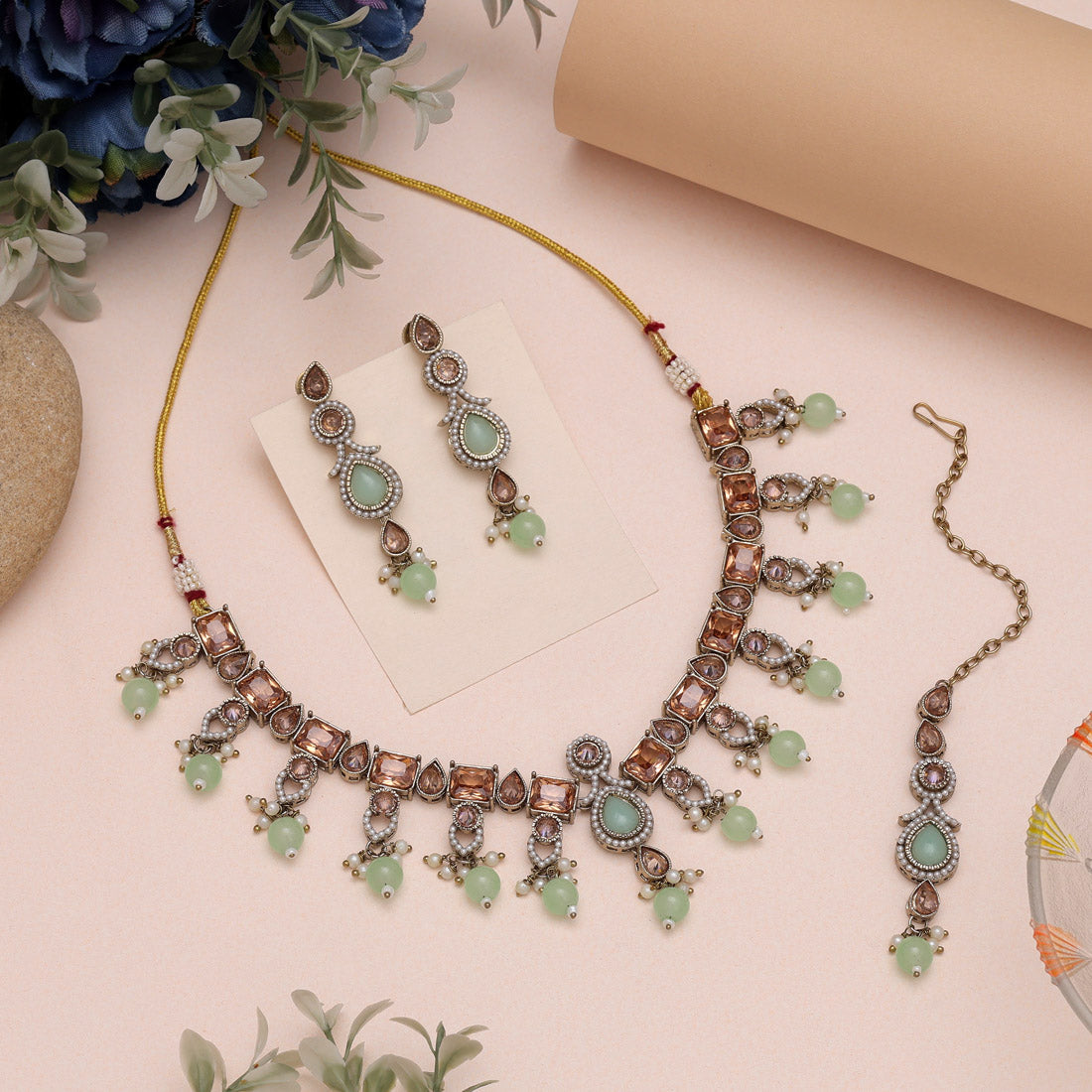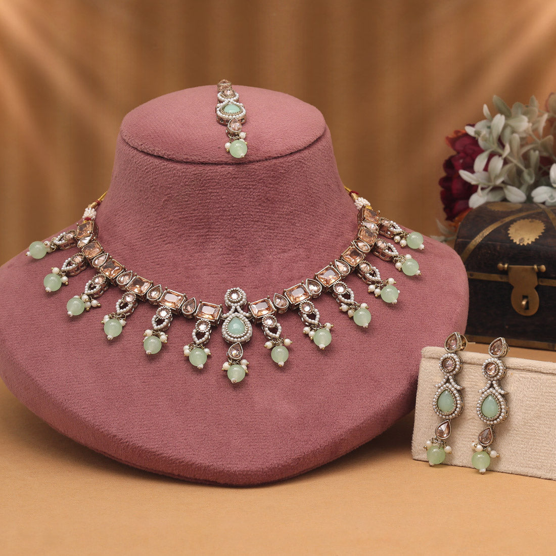 Glamorous Pista Green Color American Diamond Necklaces Set With Shine Touch