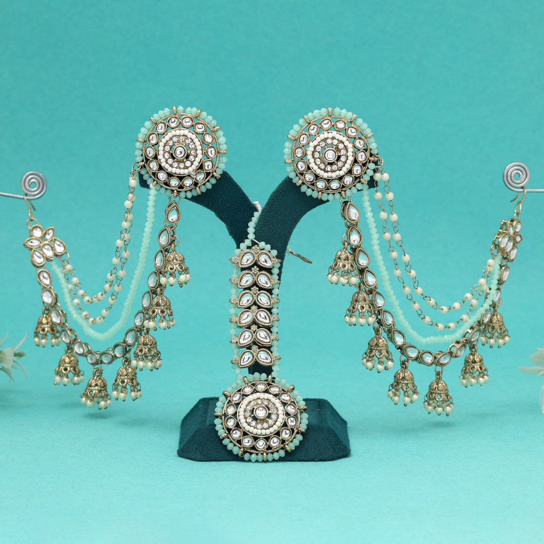 Fresh Pista Green Color Kundan Earrings With Maang Tikka