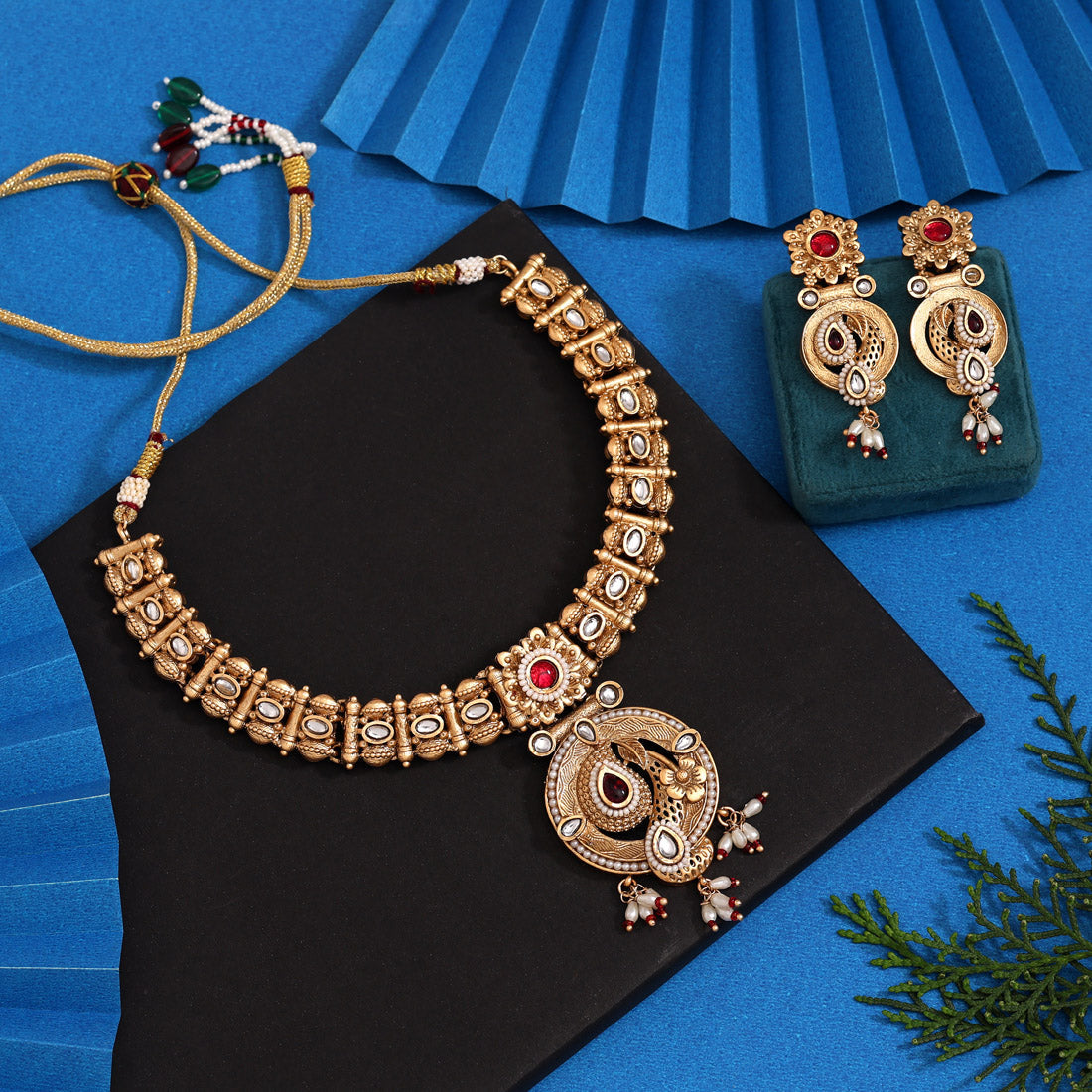 Rani Color Matte Gold Rajwadi Temple Necklace Set