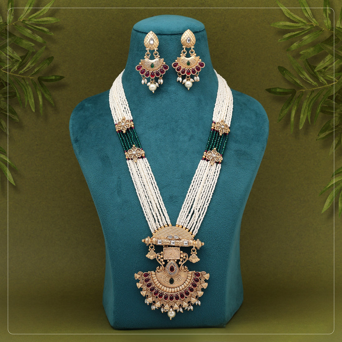 Rani & Green Color Meena Work Long Matte Gold Rajwadi Temple Necklace Set
