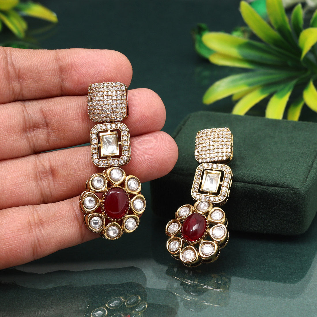 Elegant Red Color American Diamond Earrings For Classic Evening Style