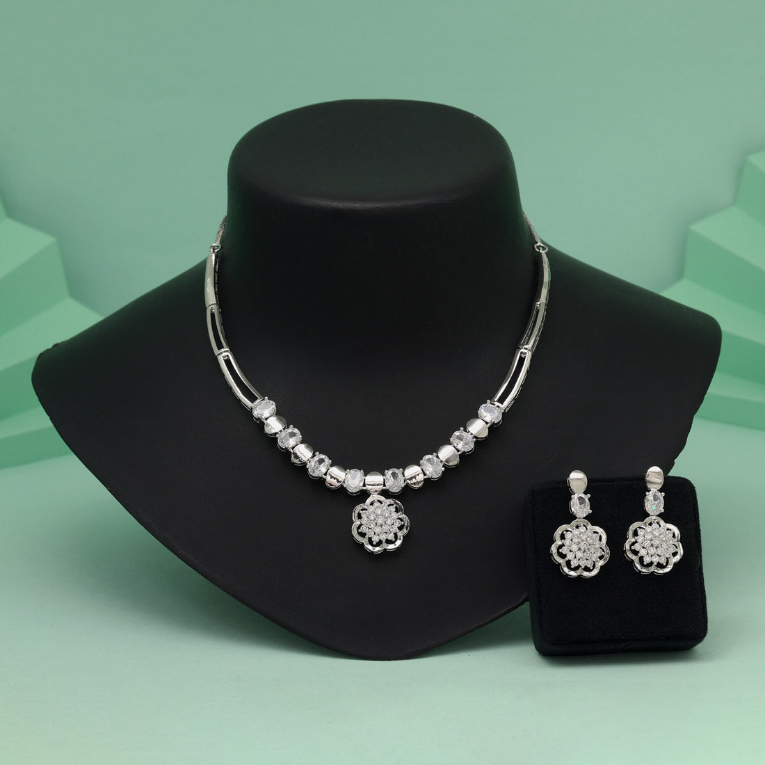 Silver Color American Diamond Necklace Set Designed For Elegant Day Or Night Wear