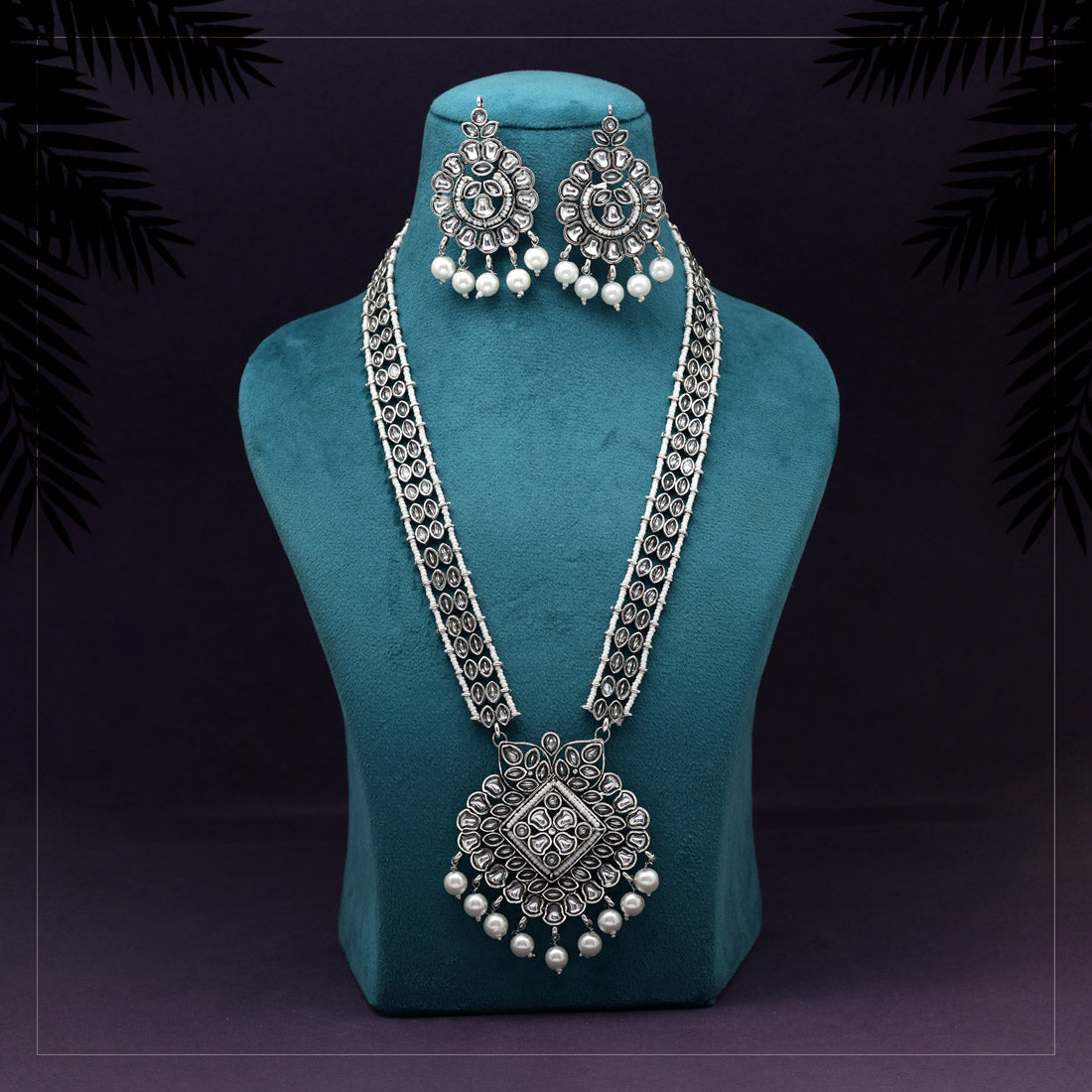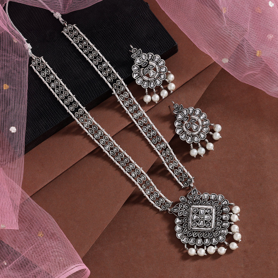Silver Color Long Oxidised Kundan Necklace Set