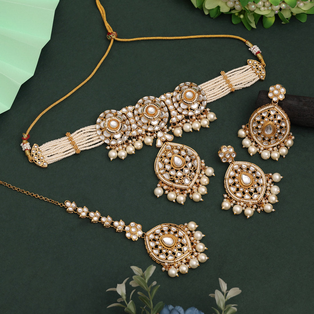 White Color Choker Kundan Necklace Set For Elegant Bridal Ensemble