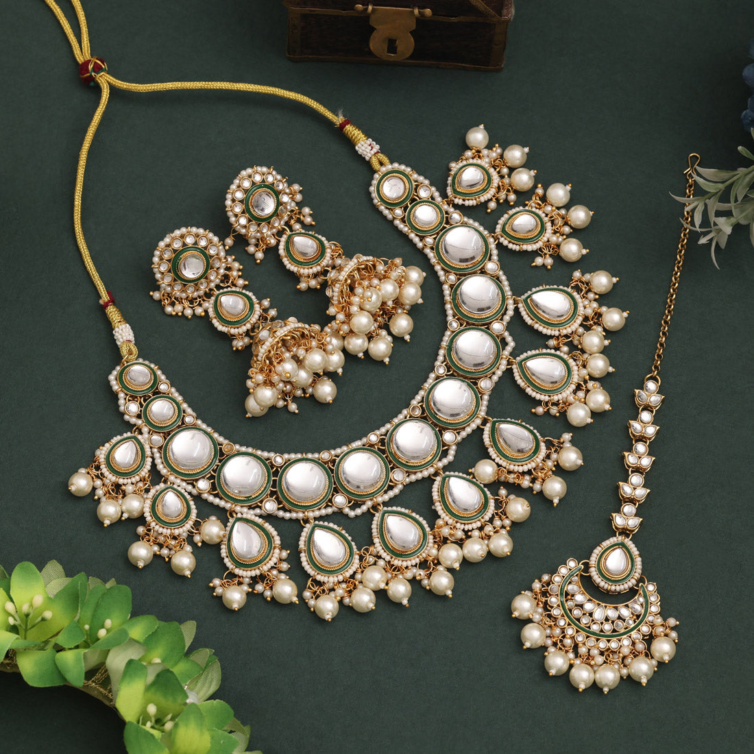 1 Piece Of Necklace:: 1 Pair Of Earring:: 1 Piece Of Maang Tikka