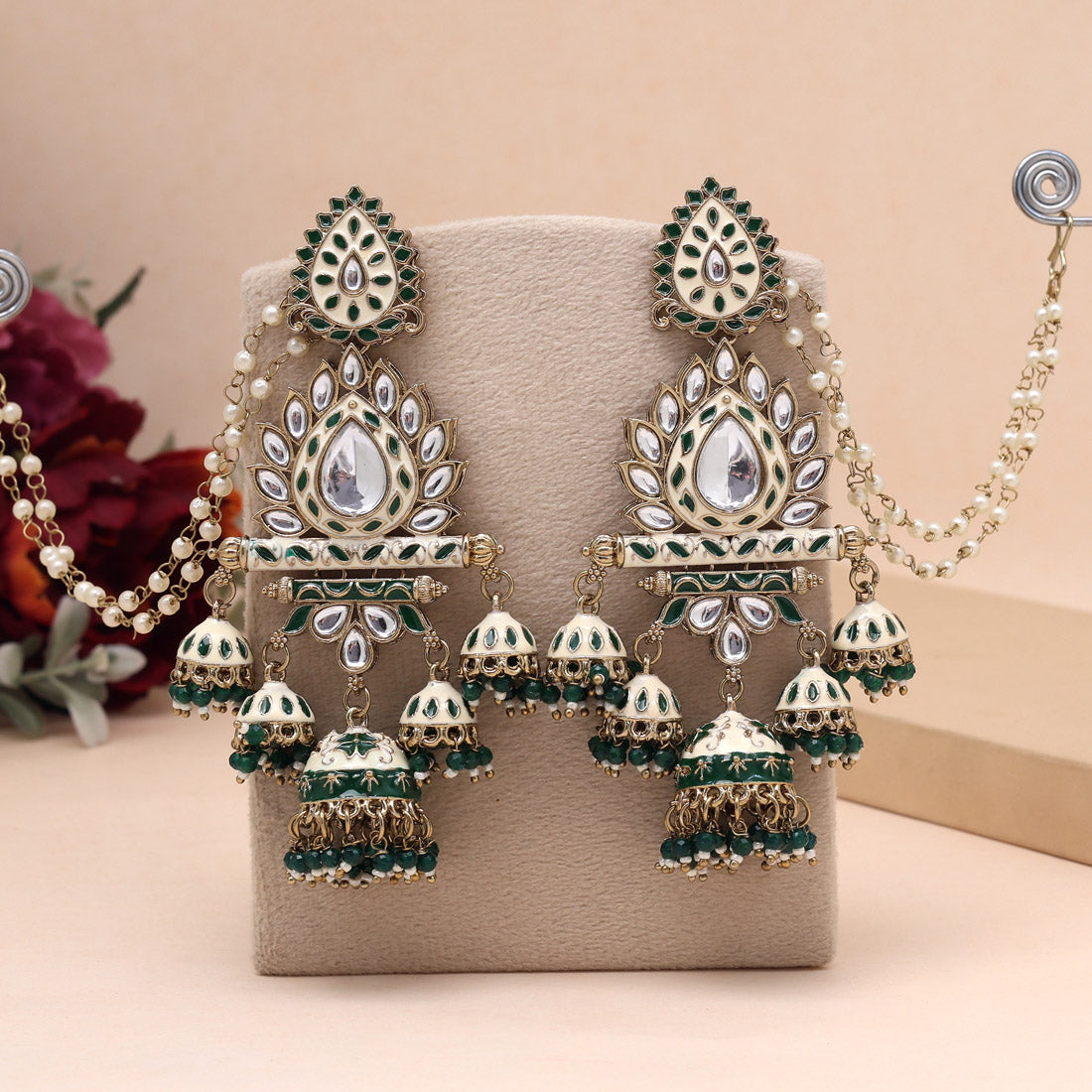 Ethnic White & Green Color Kundan Meenakari Earrings