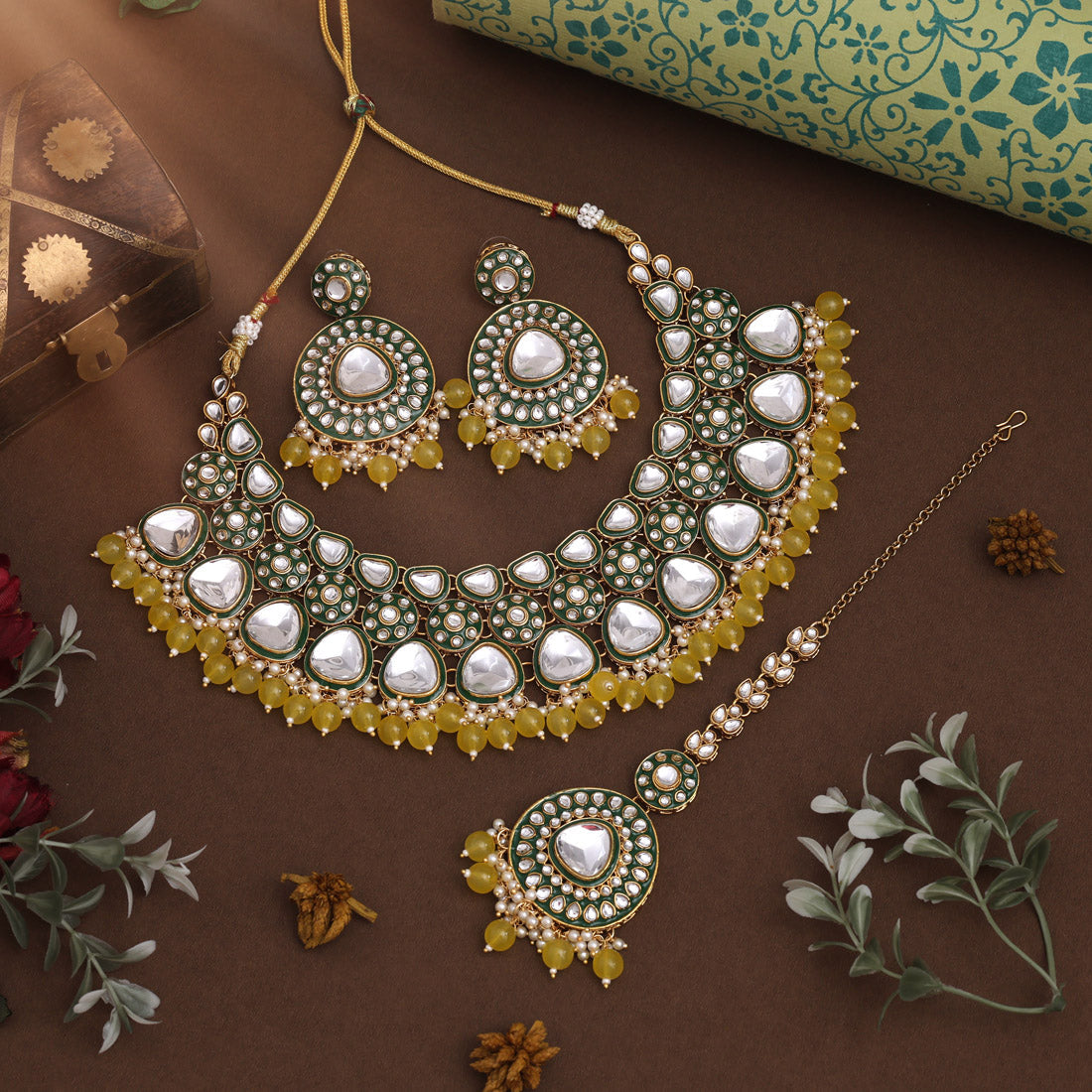 Yellow Color Meena Work Kundan Necklace Set For Traditional Festive Vibe